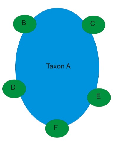 Peripheral isolates. Taxon A is the original species. B-F are new species that evolved from the original species due to adaptation for the particular environments in that area. The original species is usually more of a generalist, able to survive in many environments.