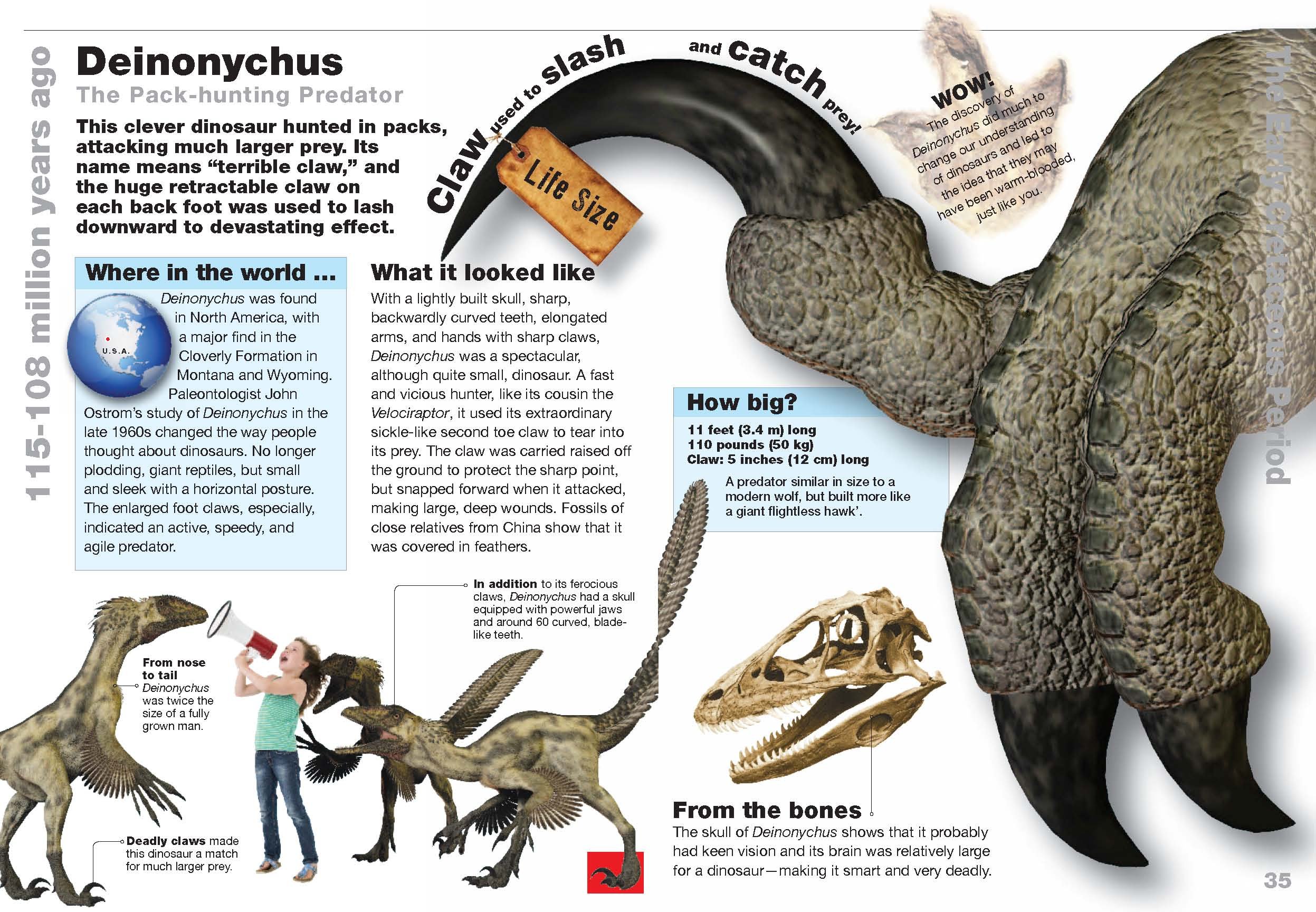The book begins with a short introduction to dinosaurs and the book. A fold-out timeline follows, which puts all the animals discussed in the book in its appropriate place in time. The timeline includes a brief description of each period within the Mesozoic Era, commonly known as the Age of Dinosaurs. The meat of the book is a generally two page description of 26 different animals. Each animal gets a brief discussion of what it looked like, where it lived, and a few interesting factoids that have been pulled “from the bones” as a section for each animal is called.